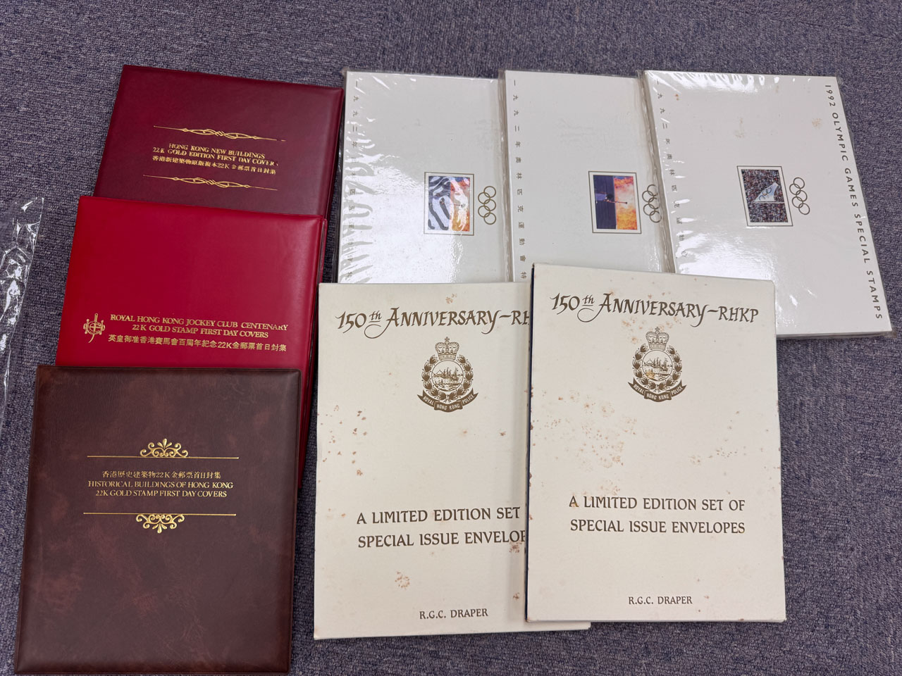 香港皇家警察150週年紀念封冊2冊、香港1992年奧林匹克運動會紀念郵冊3冊及香港22K金郵票首日封集3冊。