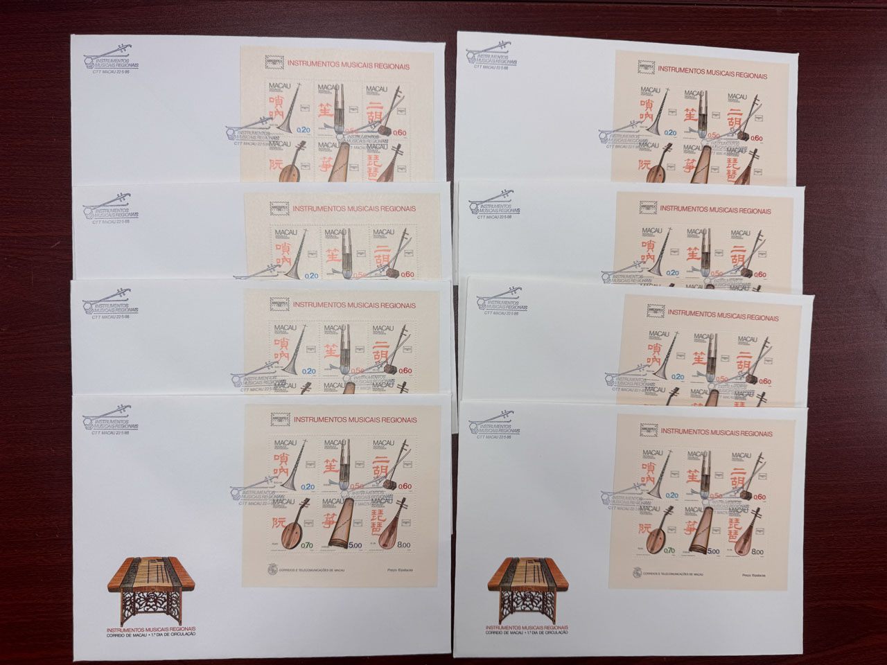 1986年5月22日澳門樂器小型張首日封8枚,品相上佳。