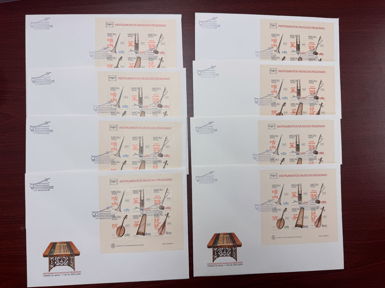 1986年5月22日澳門樂器小型張首日封8枚,品相上佳。