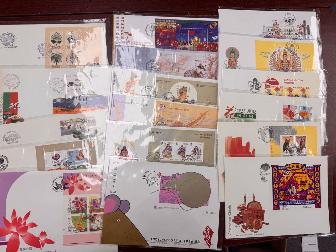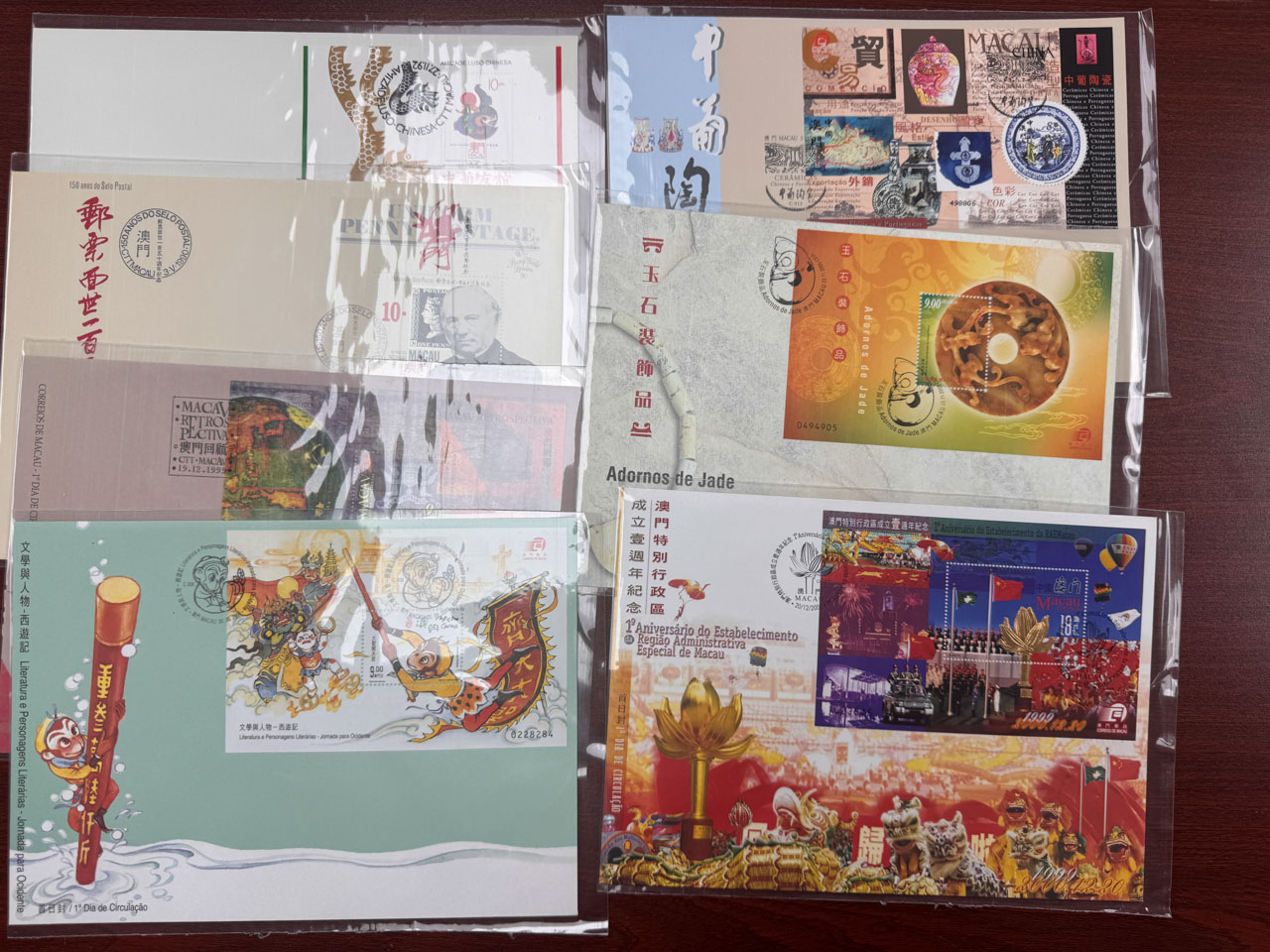 1987-2000年一組約24枚澳門小型張首日封,包括有扇畫、陸上交通工具、水上飛機、漢城市運會及很多其他等。請預覽。