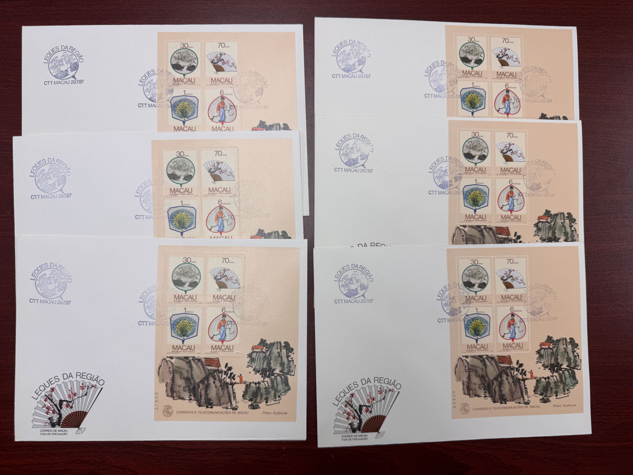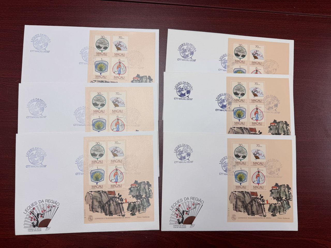 1987年7月29日扇畫小型張首日封6枚,均無地址,品相上佳。