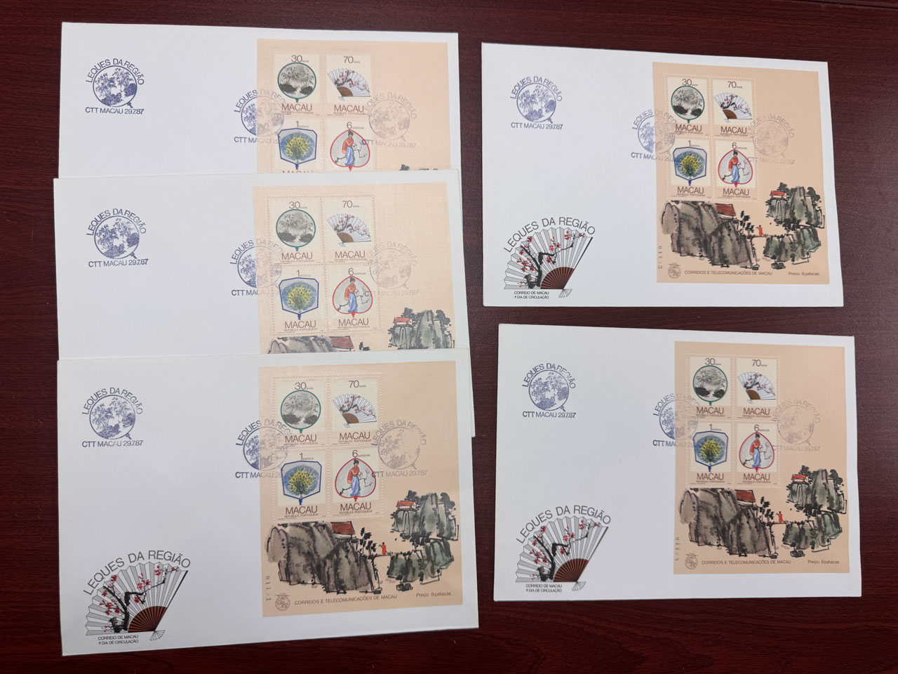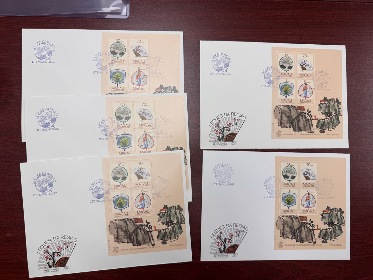 1987年7月29日扇畫小型張首日封5枚,均無地址,品相上佳。