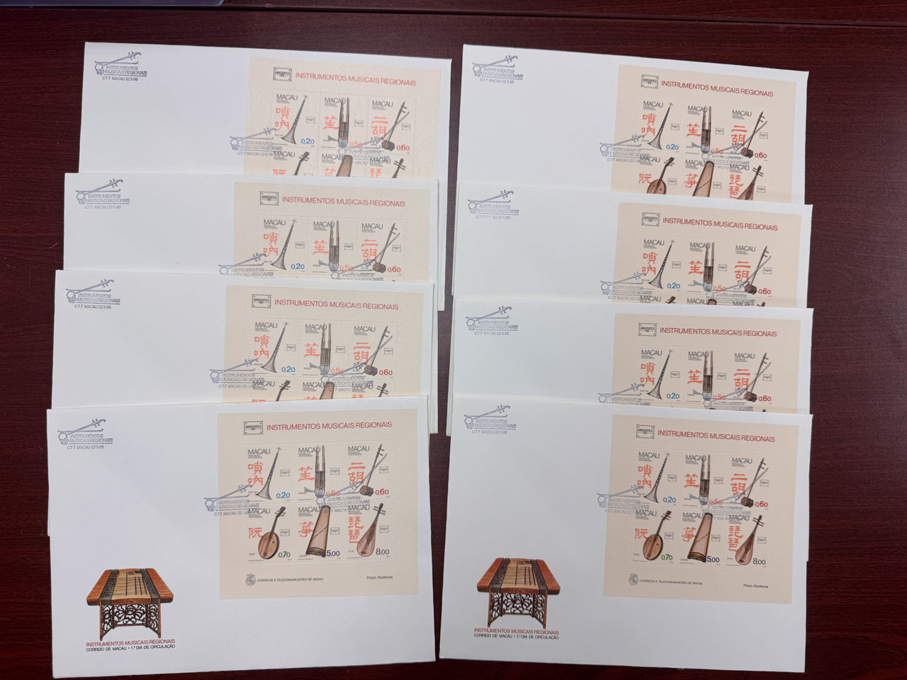 1986年5月22日澳門樂器小型張首日封8枚,品相上佳。