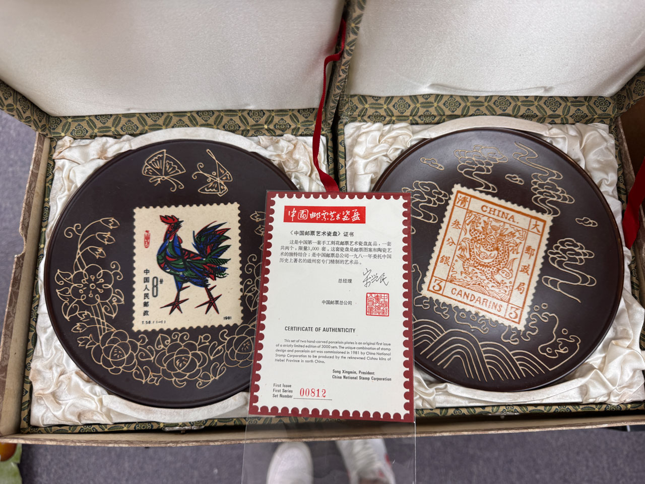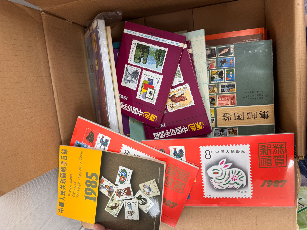 一大箱集郵書及一組兩件印有中國郵票瓷盤。