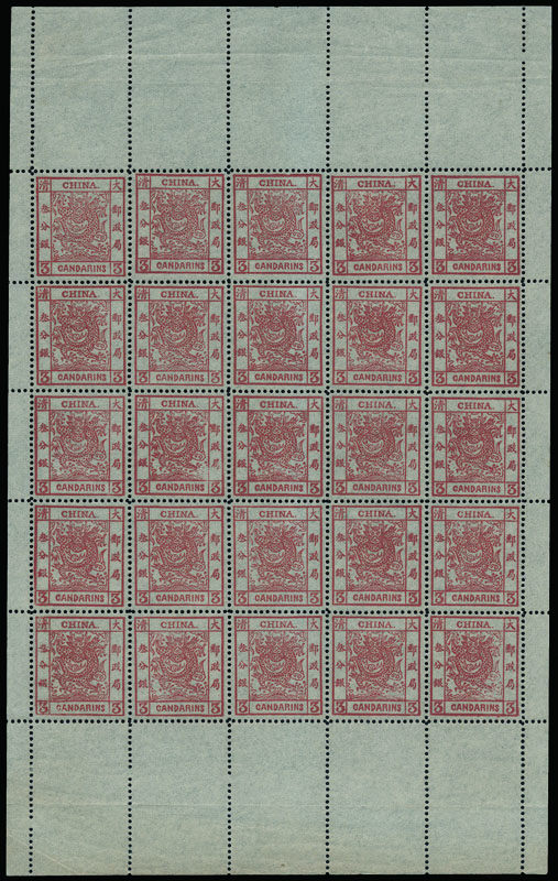 1878年薄紙大龍3分銀新票全版25枚,帶完整寬闊紙邊,第一版式,其中第“21”枚顯示由缺墨導致的“叁”及“銀”字破版,同時左下角“3”字下端多了一點與下框線相連;第5枚的上邊框顯示斷框;第12枚由於缺墨導致“爛龍爪”。原膠無貼,背膠豐潤,用色厚實,框線顯示較粗,品相一流。非常難得的大龍3分銀全版票,更難得的是這種頂級品相。
